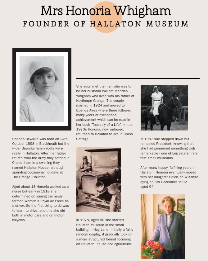 Hallaton Museum was the inspiration of Mrs Honoria Whigham who wanted to record, for future generations, a way of life in a small village community which was rapidly changing.